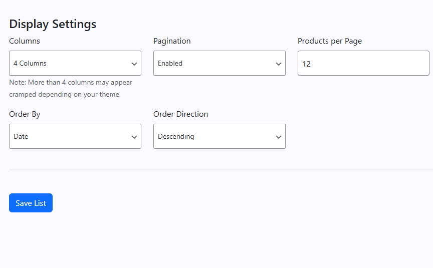 Create as many product lists as you need, each with its own display settings.